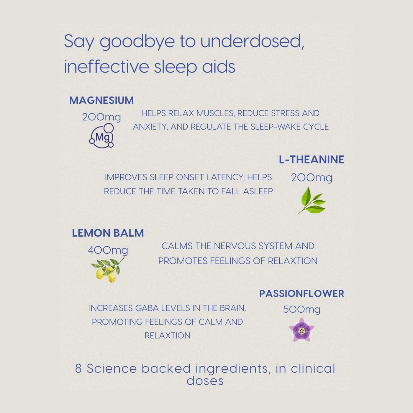We've blended 8 active, science-backed ingredients to support your body’s natural sleep processes — no melatonin, no synthetic sedatives, just clean, effective, plant-based support.